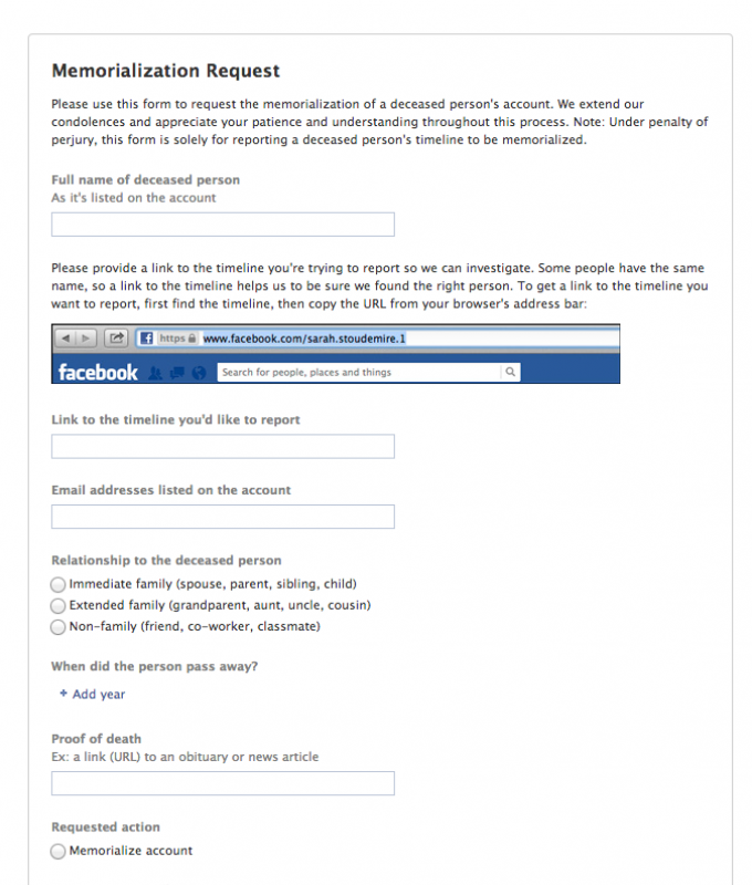 The memorialisation request process (below) requires a ‘proof of death’ link to an obituary or news article about the person’s death. What a truly digital world we now live in.