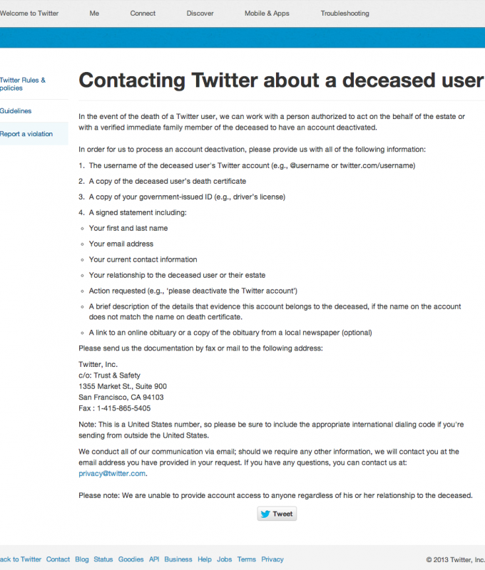 Both Facebook and Twitter have designated spaces explaining the protocol for profile removal or ‘memorialisation’.
