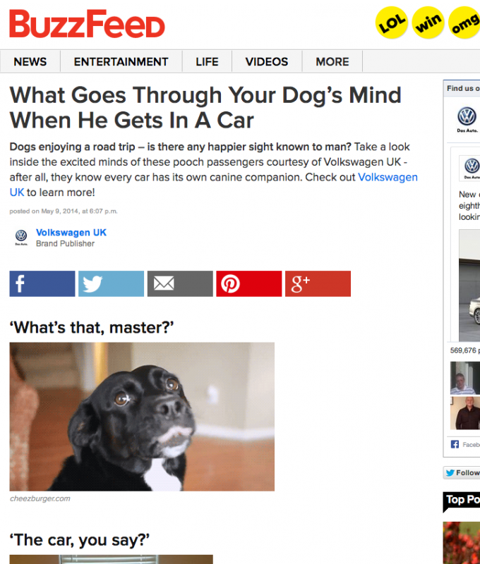 Take Volkswagen for example, they’ve embraced Buzzfeed with open arms creating content such as “12 Stages Of Your Relationship With Your Car” and “14 Things Dads Get Abnormally Excited About”. Whilst this may not be too relevant to what Volkswagen actually sell, they’ve received a vast amount of shares and likes, increasing their authority and trust with users. They’ve moved beyond using generic advertising drivel, and are sharing interesting and engaging content intertwined with their overall marketing strategy.
