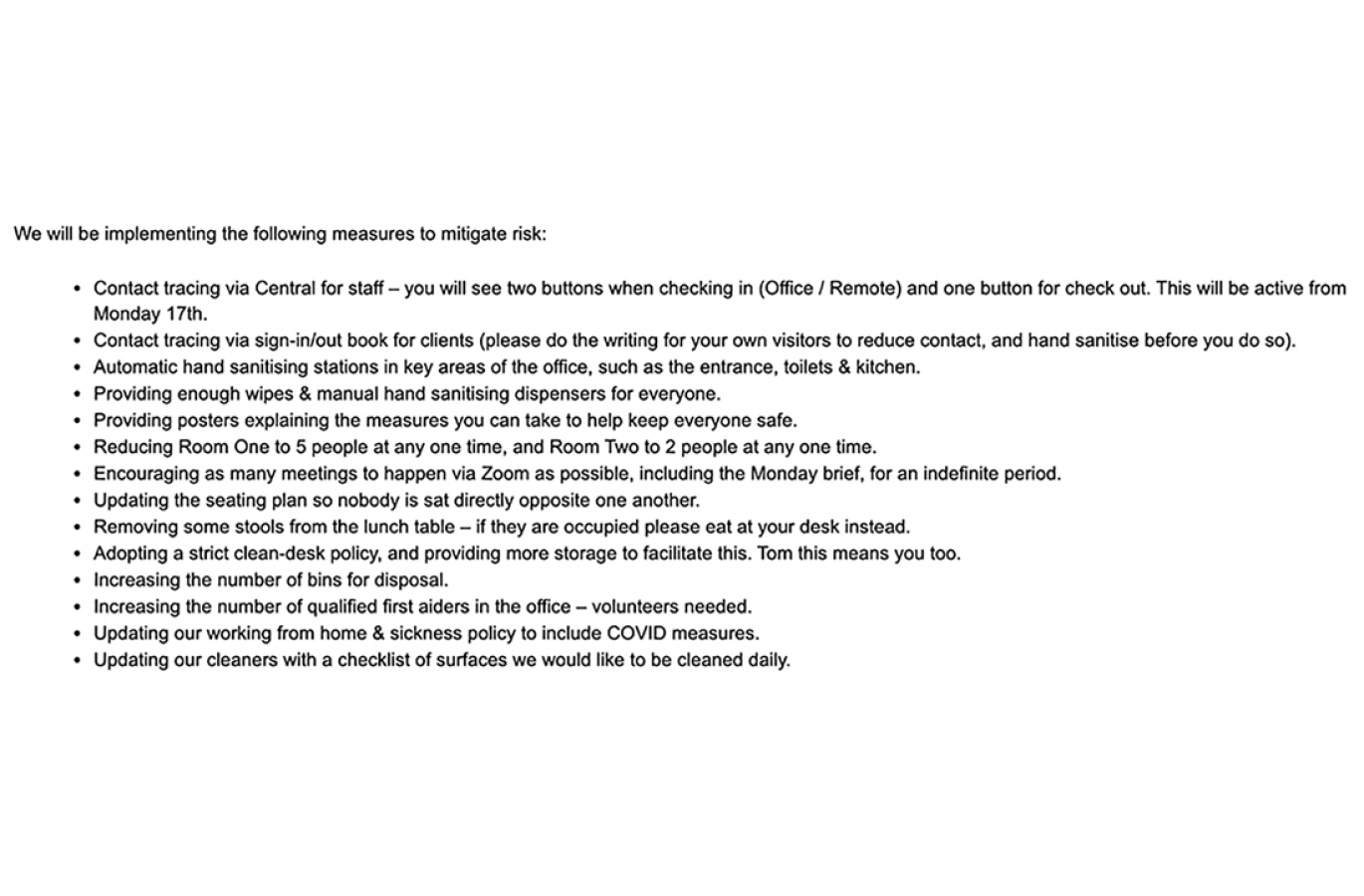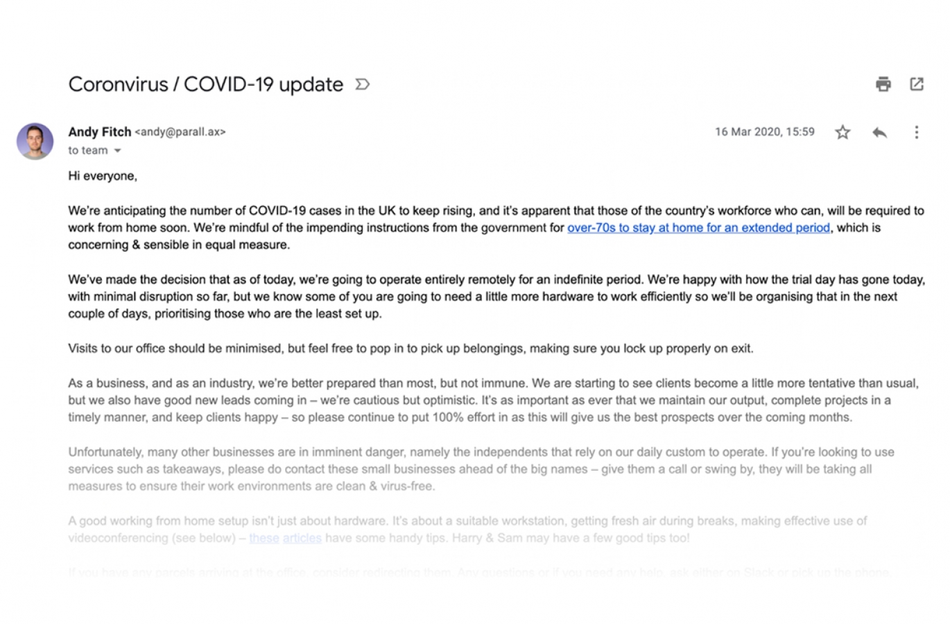 Our plan from the very beginning was to communicate regularly with staff, looping everyone in with decisions within hours of making them, and providing company-wide updates after each major government briefing.